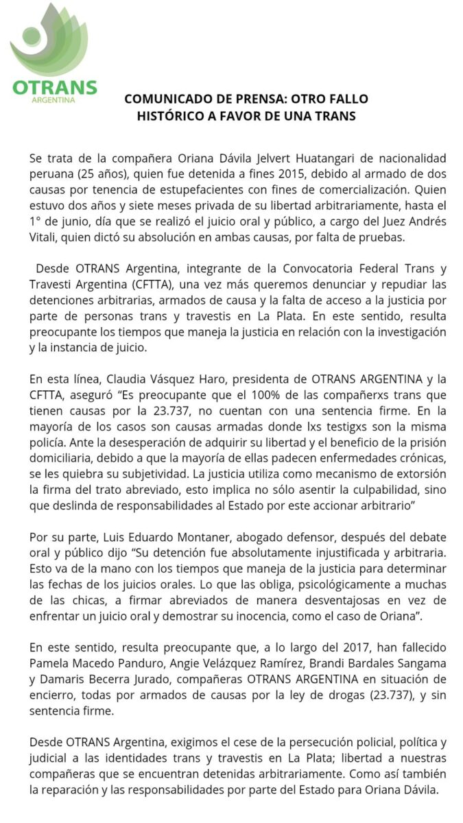 Hoy, nos reunimos en la Honorable Cámara de Diputadxs de la Provincia de Buenos Aires, entre OTRANS ARGENTINA, la Asamblea Vecinal del Mondongo y el equipo de trabajo de la diputada Florencia Saintout, presidenta del Bloque de Diputadxs por Unidad Ciudadana, quien tuvo un papel clave para este primer encuentro en su despacho. Allí participaron: Claudia Vásquez Haro, presidenta de OTRANS ARGENTINA, con algunas miembras de la organización; Daniel Domínguez, presidente de la Asamblea Vecinal del Mondongo, y algunxs vecinxs, Agustín Martinuzzi Secretario de Extensión de la Facultad de Periodismo y Comunicación Social-UNLP y Facundo Ochoa, responsable del Centro Cultural la Vecindad. Durante la jornada, se puso en contexto la realidad que viven tanto las compañeras trans y travestis, como lxs vecinxs de la llamada “zona roja platense”. Vásquez Haro dijo “Nosotras no somos el enemigo, las compañeras son excluidas sociales, son el chivo expiatorio para la justificación que se combate al narcotráfico y la inseguridad”. Por su parte Domínguez manifestó su preocupación por la venta de drogas que involucra ahora, no solo a trans y travestis, sino a mujeres cis, niñxs y adolescentes. Y también planteo la posibilidad de la reubicación de la zona Roja”. Se acordó: Repudiar la venta de droga en la zona Roja, que pone en peligro a las mismas compañeras trans y travestis y a lxs vecinxs. Por otro lado, se asumió el compromiso de ambas partes de exigirle al Estado la implementación del Cupo Laboral Trans en la Provincia de Buenos Aires, y en la Ciudad de La Plata. Allí surgió la creación de una mesa de trabajo conformada por integrantes de distintos sectores implicados de la sociedad civil, distintas facultades de la UNLP, como también del poder político, judicial y las fuerzas de seguridad. Desde OTRANS ARGENTINA, celebramos este espacio, porque entendemos que en un contexto político y social donde hay un retroceso exponencial en relación a nuestros derechos humanos, es necesario generar un diálogo articulado con diferentes actores sociales, para seguir exigiéndole al estado condiciones de vida dignas en relación al trabajo, la educación y la vivienda, a la que tanto es negada nuestro colectivo.