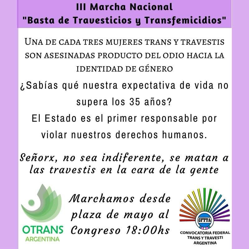 Convocamos a la III Marcha Nacional “Basta de travesticidios/transfemicidios” para toda la ciudadanía en general, el día 28J a las 18:00hs, para exigirle al Estado basta de violar nuestros derechos humanos.