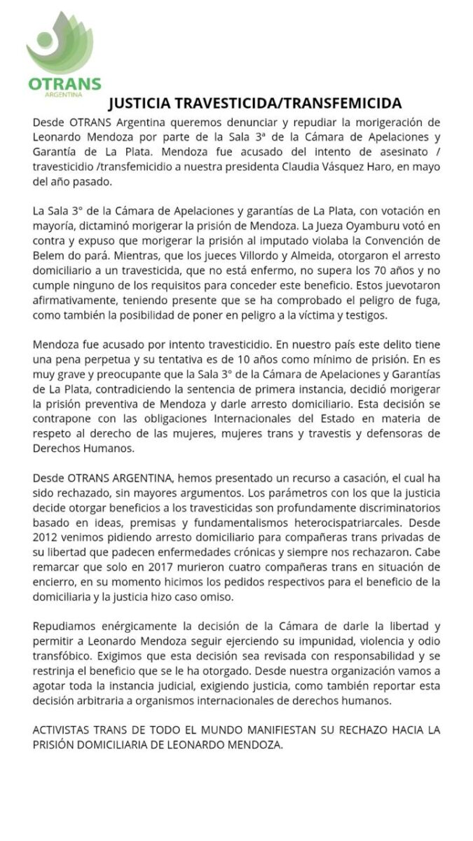 Desde OTRANS ARGENTINA , como parte del Fondo Internacional Trans (FIT) queremos saludar y felicitar el enorme trabajo que realiza el FIT en beneficio del movimiento trans global. Asimismo, destacar la participación de nuestra presidenta Claudia Vásquez Haro, como parte de les miembrxs expertxs integrante del PCA.