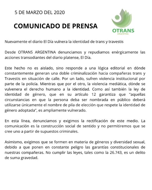 Desde OTRANS Argentina, mediante nuestra secretaria, Aradia García, se dio una capacitación en cuestiones de géneros y diversidad sexual, con una perspectiva en comunicación y derechos humanos, en el marco del curso de ingreso de la Tecnicatura en Acompañante Terapéutico, perteneciente al Instituto Superior de Formación Docente N° 210 – Abasto. El objetivo del encuentro fue: contextualizar los avances y retrocesos en derechos y políticas públicas de la comunidad TLGBI, aportes feministas, y las decisiones políticas del Kirchnerismo para la ampliación de derechos de los colectivos de la diversidad sexual, entendido a los derechos humanos como políticas de Estado (Ley de Salud Mental, Ley de Matrimonio Igualitario, Ley de Identidad de Género), problematizar la construcción colectiva de la memoria trans y travesti de Argentina y la articulación entre activismo TLGBI y Política partidaria. Época de los 70′, 90′. Transfeminismos e identidades emergentes, desarrollo histórico de los estudios feministas como de la producción de conocimiento TLGBI desarrollada en el margen de la academia. Feminismos populares, liberales, radicales: Epistemología del sur (De Sousa Santos); Epistemología del Barro (Saintout/Varela); Epistemología del despojo (Vásquez Haro).