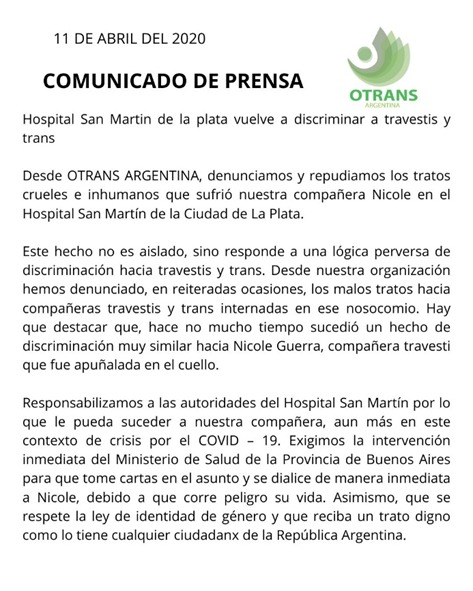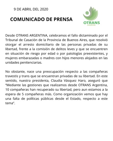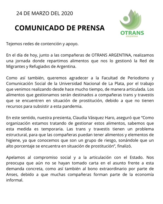 OTRANS ARGENTINA filial Ensenada, continuó con la jornada de entrega de bolsones de alimentos, en articulación con la Mesa de Diversidad de Ensenada y el Municipio a cargo del Intendente Mario Secco. Nicole Vanucci, referenta territorial de OTRANS ARGENTINA filial Ensenada, aseguró que “Estoy feliz de que me hayan convocado y que hayan dado la confianza para poder encabezar la filial en Ensenada. Esta lucha es constante, es para que todas las compañeras trans y travestís, puedan tener su espacio. Tomó el compromiso ético y político en militar día a día, para que a ninguna compañera se les siga vulnerando sus derechos humanos básicos. Como así también para que se implemente, de manera efectiva en toda la región, el cupo laboral travesti y trans”, relató. Cabe destacar la responsabilidad política que ha tenido el distrito de Ensenada respecto al compromiso para con el movimiento de la diversidad sexual, pero principalmente, el colectivo travesti y trans en materia alimentaria y salud integral.