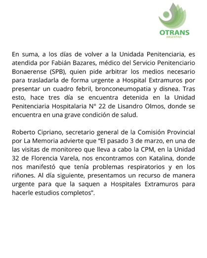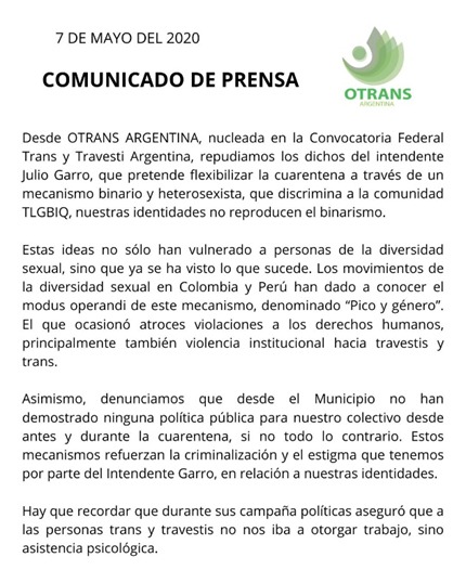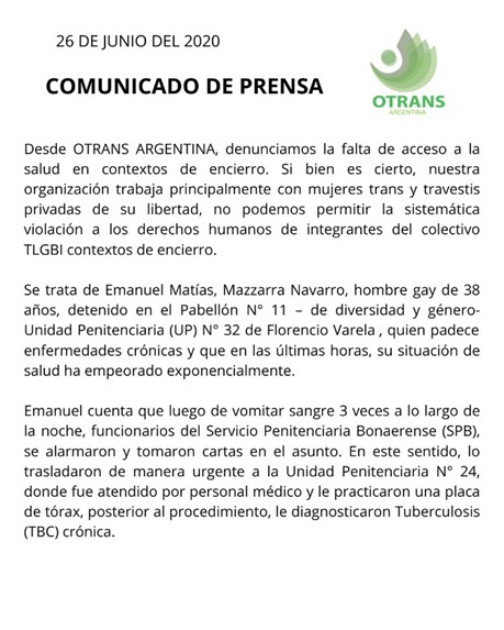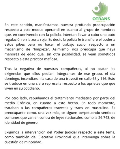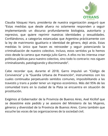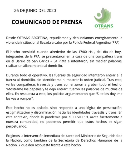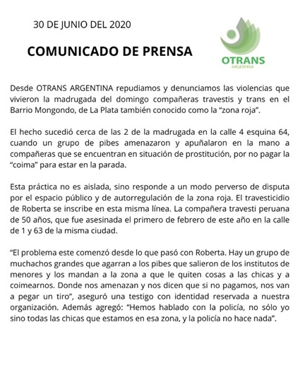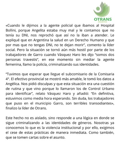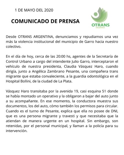 Desde OTRANS Argentina, participamos del operativo sanitario de testeos en el barrio José Luis Cabezas, donde se encuentran más de 30 compañeras trans y travestis viviendo allí, convocado por la Municipalidad de Ensenada a cargo de Mario Secco, junto al Ministerio de Salud de la provincia Buenos Aires; el Ministerio de Desarrollo Social de la Provincia de Buenos Aires; y el Municipio de Berisso a cargo de Fabián Cagliardi. Con el objetivo de realizar un operativo sanitario de testeos en el barrio José Luis Cabezas, donde se encuentran más de 30 compañeras trans y travestis viviendo allí. Celebramos el reconocimiento Estatal frente a todo el trabajo territorial de nuestra organización, como también entendemos que es muy necesaria esta articulación con la sociedad civil en momentos tan duros como los que estamos viviendo.