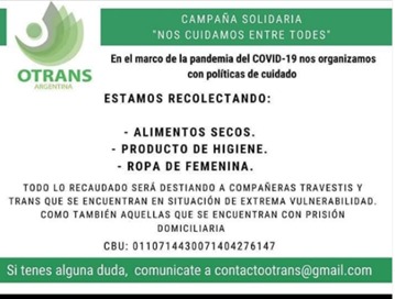 Como es de público conocimiento, la pandemia del COVID-19, ha mostrado los graves problemas estructurales que tenemos las personas travestis y trans. Por eso, seguimos tejiendo redes de contención y ayuda solidaria. Estamos recolectando ropa femenina para compañeras travestis y trans. Se viene el invierno y muchas de ellas viven en casas precarias. – Como la mayoría sobrevive de la prostitución, gran parte se ha quedado sin ingresos económicos, por ende, no puede comer. El Estado, tanto a nivel Provincial como Nacional, ha dado ayuda a este sector, sin embargo, no alcanza. – Hoy, te pedimos tu colaboración ¡Sumate!