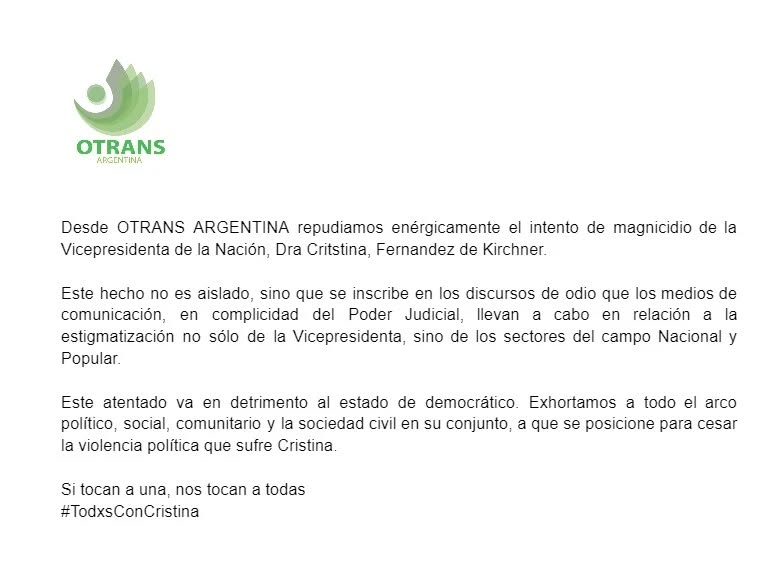 Repudiamos el intento de asesinato de nuestra Vicepresidenta, Cristina Fernández de Kirchner.
