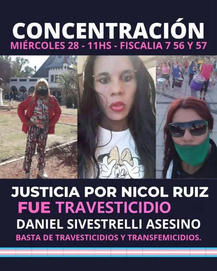 En la noche del 23 de septiembre Nicol Ruiz, mujer trans de 35 años, fue brutalmente agredida por Daniel Sivestrelli tras salir en defensa de su hermana. Fue ingresada al Hospital San Martin de La Plata donde estuvo internada hasta que falleció el 26 de septiembre producto de los golpes. Nicol es mamá y tiene dos hijxs. Estaba en tratamiento de diálisis y hace años esperaba un trasplante de riñón. A su vez, estaba a la espera su nuevo DNI Y por ingresar a trabajar en el mismo hospital donde falleció. Familiares y Amigxs nos convocamos a concentrar en pedido de justicia por el travesticidio de Nicol Ruiz el día miércoles 28/9 a las 11hs en Av 7 entre calle 56 y 57. Que se haga justicia y que se respete la identidad de Nicol bajo la ley de Identidad de Género. NICOL RUIZ PRESENTE AHORA Y SIEMPRE. DANIEL SIVESTRELLI ASESINO.