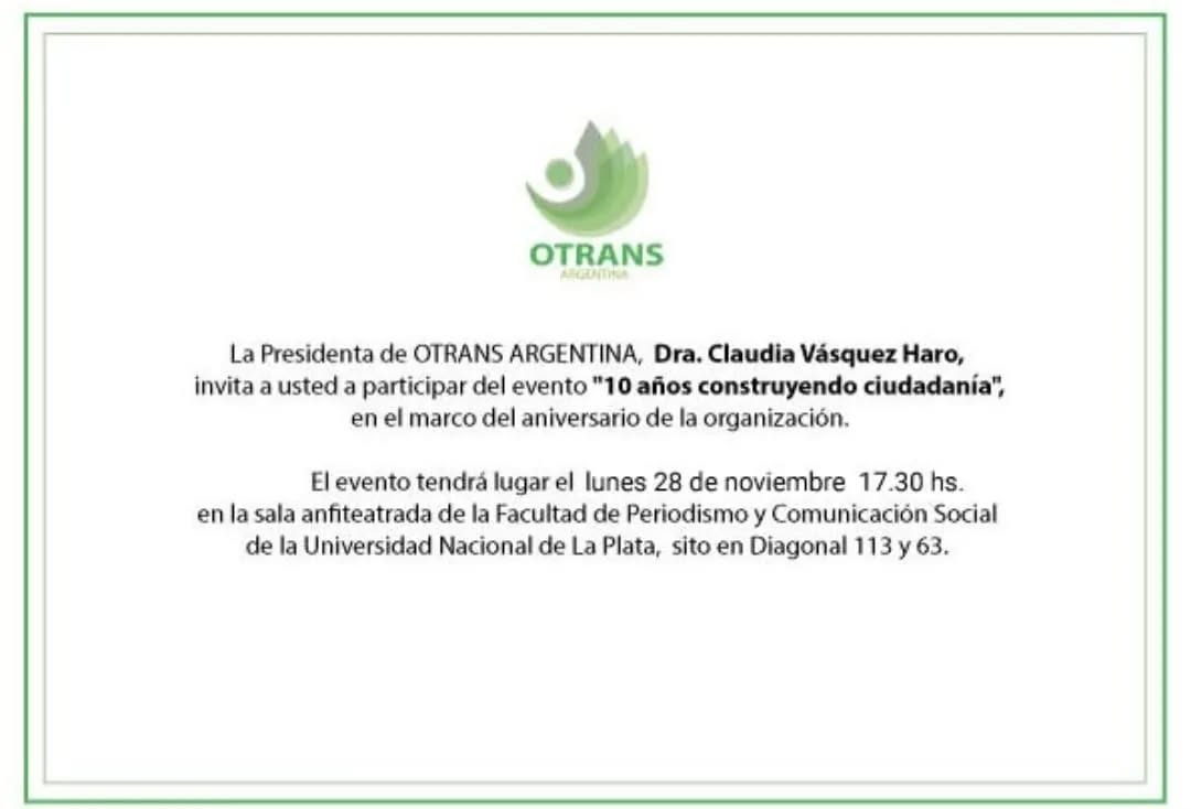 Este lunes 28 de Noviembre, a las 17.30 ha te esperamos en la Sala Anfiteatrada de la Facultad de Periodismo y Comunicación Social, de la UNLP (Diag.113 y 63), para homenajear una década de activismo y militancia inclaudicable. “10 años de lucha, acción y resistencia significan un aprendizaje a través de procesos colectivos que nos han enseñado a generar alianzas estratégicas y cohalisionar con otres. Devenimos sujetas políticas, y nos posicionamos ante el Estado como interlocutorxs válidas, transformadoras de nuestras propias realidades”. Claudia Vásquez Haro, presidenta OTRANS ARGENTINA. ¡Esperamos contar con tu presencia!