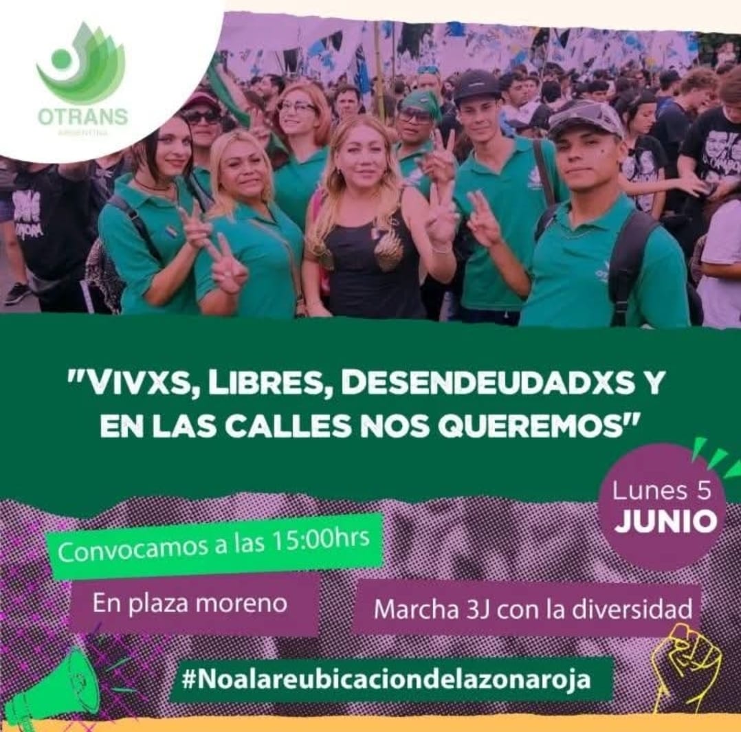 En el marco del Ni Unx Menos convocamos a marchar este lunes 5 de Junio a las 15:00 hs por las calles de nuestra ciudad de La Plata. Ahí plantearemos nuestras demandas colectivas. Y salimos a decir “Vivxs, Libres, Desendeudadxs, en las calles y gobernando nos queremos”. Las Travestis y Trans como parte del movimiento transfeminista marchamos no solo por las que caminaron, sino por las que caminan y caminarán esta ciudad. En ese sentido una vez más decimos: No a la reubicación de la zona Roja, impulsada por el intendente Julio Garro del municipio La Plata Pedimos y exigimos justicia por todas las compañeras Travestis y Trans víctimas de los travesticidios e identicidios, Justicia por Nicol Ruiz, Pamela Macedo Panduro, Angie Velásquez, Dámaris Becerra Jurado, Brandi Bardales, y tantas compañeras quienes fueron víctimas de este sistema punitivo.